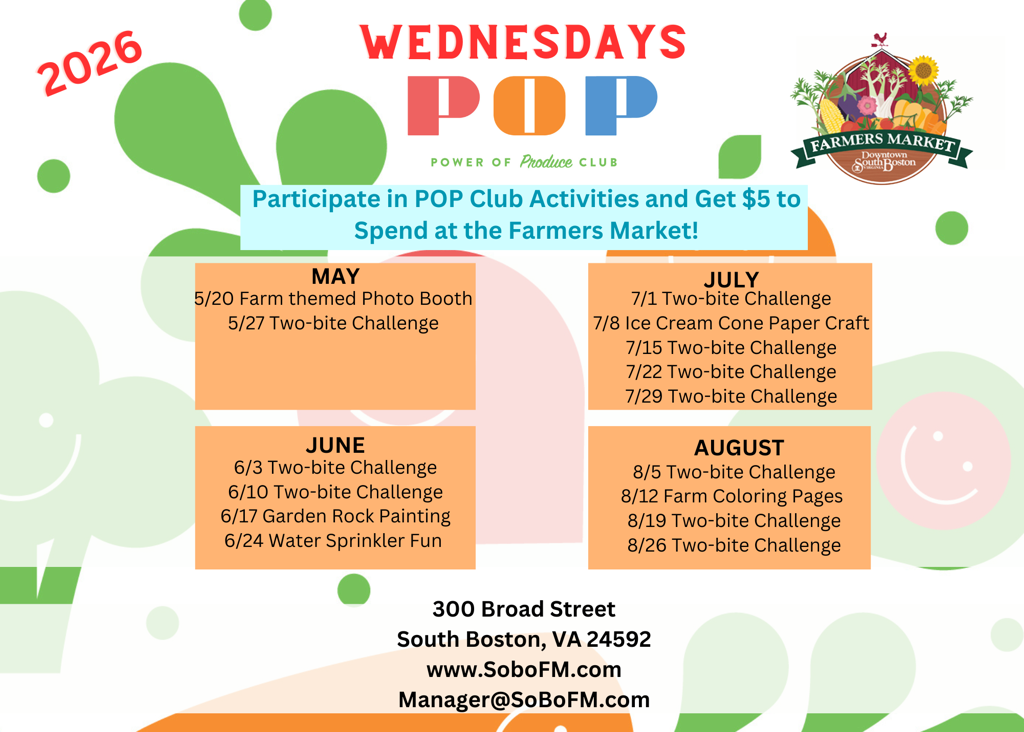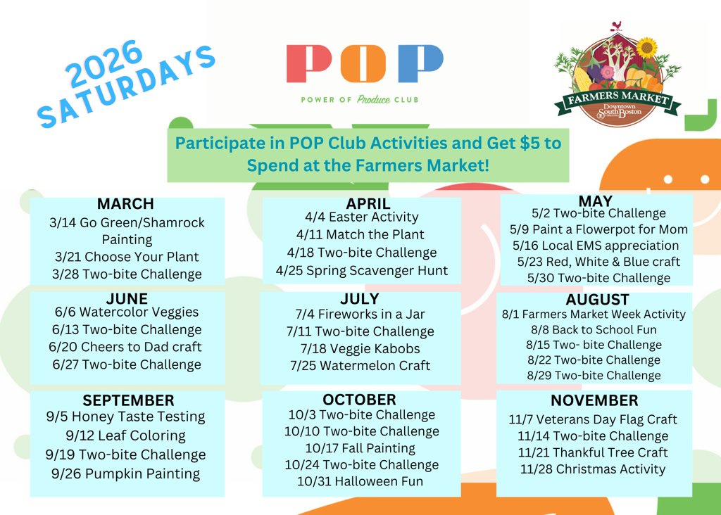 The Downtown South Boston Farmers Market offers a FREE kids program for ages 2-18: Power of Produce Club (PoP Club) .